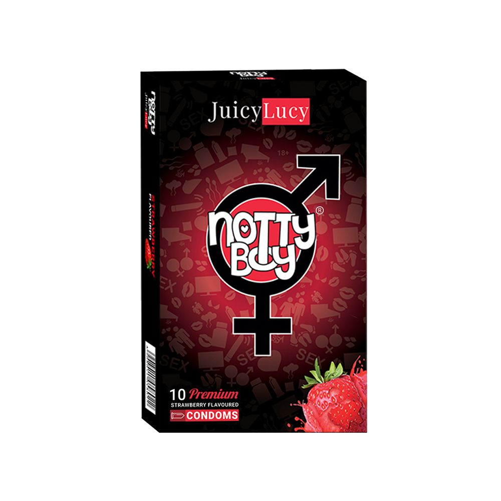 JUICY LUCY Strawberry Flavored Plain Condoms. Flavored with a tasty Strawberry aroma, making it ideal for both oral and vaginal use. Smells great, tastes even better, and has a delicious tropical Fruit flavor for a delicious sexual experience. NottyBoy flavored condoms help in enhancing romantic moments to the max with their rich strawberry flavor Dermatologically tested 100%, Electronically Tested - Each NottyBoy condom is tested electronically against any manufacturing defects Disposable Pouches With Every Pack. They are lubricated, durable, flexible, nearly see-through, and built to last. No product name or brand name is mentioned on the package box, 100% privacy is guaranteed. Your privacy is our utmost concern, All products come with discreet and confidential packaging. Nitrosamine Free, No Latex Odor, No Risky Chemicals, No Synthetic Colors – Only Natural Ingredients.
