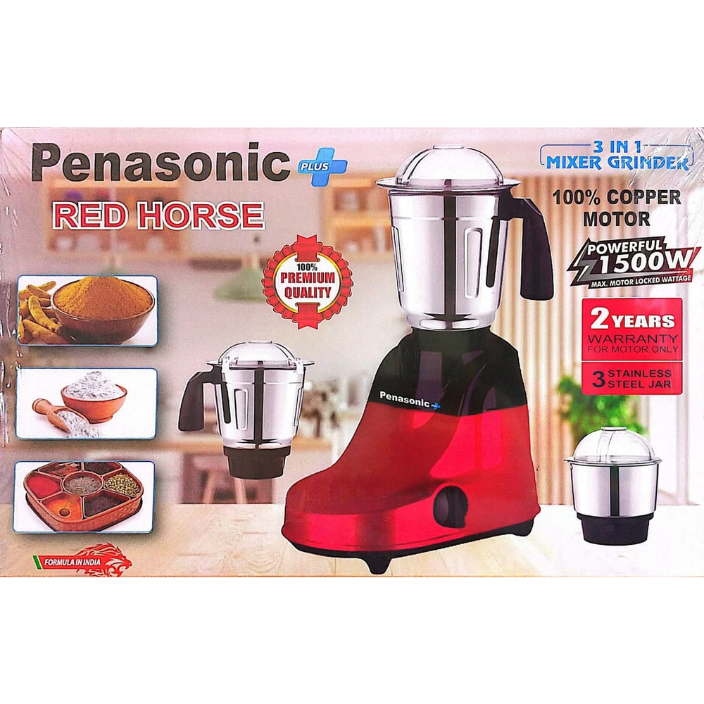 The Penasonic Red Horse 3-in-1 Mixer Blender is built for power and performance. Equipped with a 1500W 100% copper motor, it ensures fast and efficient grinding, blending, and mixing. Comes with 3 multipurpose jars to handle all your kitchen needs with ease.