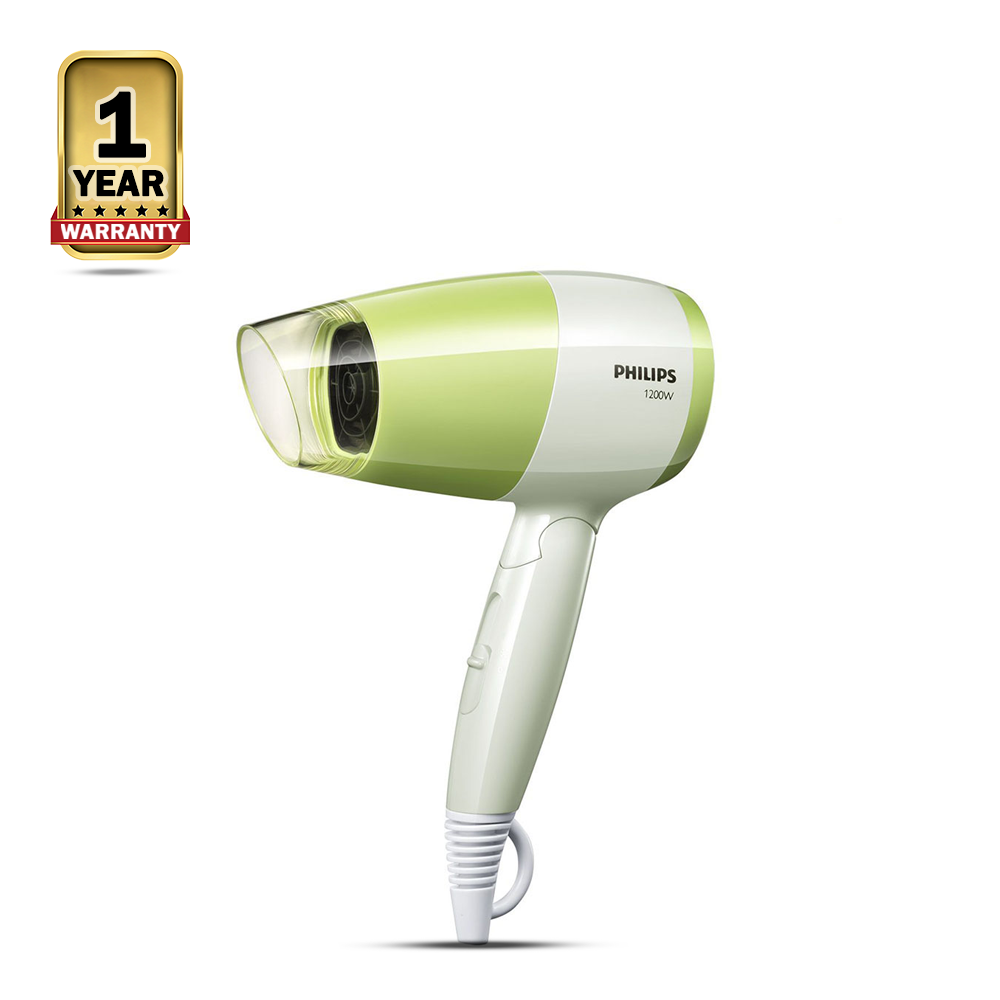 The Philips BHC015/00 Hair Dryer is a hair dryer designed for women in a stylish green color. It features a powerful 1200W motor and two heat/speed settings to help you achieve your desired hairstyle. Its compact design and foldable handle make it easy to store and travel with, while its ThermoProtect temperature setting ensures that your hair is dried quickly without overheating.