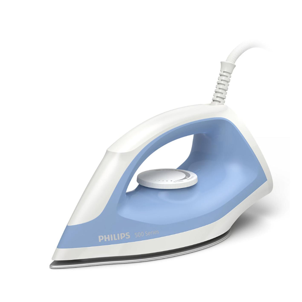 Compact and effective 500 Series is the new Philips dry iron with the smallest size and lightest weight. Its ultra-compact design enables easy and smooth ironing, for effective results with less effort. Non-stick soleplate coating The soleplate of your Philips iron is coated with a special non-stick layer for good gliding performance on all fabrics. Slim tip soleplate reaches easily in tricky areas The slim tip soleplate is designed to tackle hard-to-reach areas like collars and in-between buttons with ease. Easy temperature control Elevated temperature control is easy to operate and precise. You will always have the right temperature for your garment.