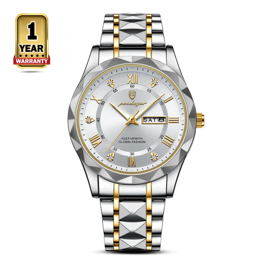 The POEDAGAR 615 Quartz Stainless Steel Watch For Men is a stylish and functional timepiece that is perfect for everyday wear. It features a round stainless steel case with a polished finish, a 41mm dial, and luminous hands and markers for easy visibility in low-light conditions. The watch also has a date window and a week display, making it a great choice for those who need to keep track of their schedule.