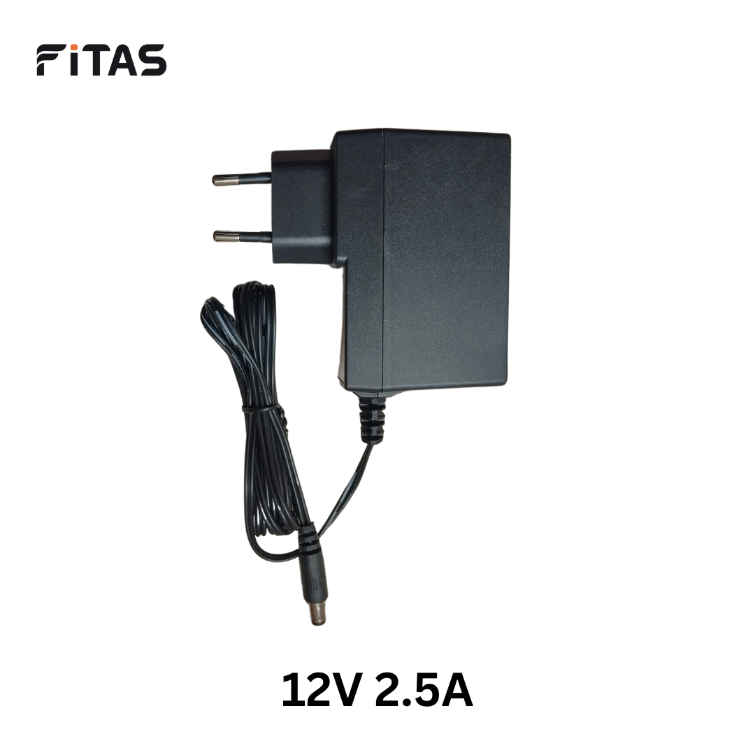 Fitas 12V 2.5A Power Adapter — Reliable DC adapter with 5.5×2.1mm US wall plug, 32-inch cable, and wide input range (100-240V AC). Ideal for CCTV cameras, routers, mini UPS, and other 12V 2.5A devices.