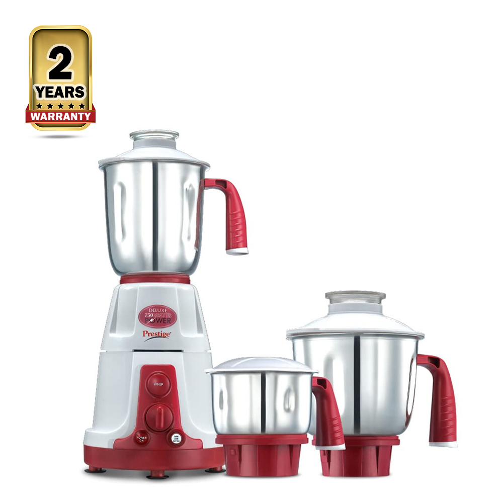 Prestige Deluxe VS Mixer Grinder with 3 Jars - 750W - Red & Silver that can handle a variety of tasks, from blending smoothies and juices to grinding spices and chopping nuts. It has a powerful 750W motor and four stainless steel blades that can easily crush ice and frozen fruits. The blender also has a number of preset functions, such as smoothie, juice, and pulse, that make it easy to get the perfect results every time. Troubleshooting guidelines: i) Jar safety lock to ensure safety - Product won't start if not locked correctly ii) Operating noise levels between 80-90 dB iii)Do not run the mixer grinder for more than 5 minutes continuously. Give a gap of 2 minutes if you need to use for more time i) Motor type- 750 W ii) 3 Stainless Steel Jar i)Flow Breaker design ii) 5 multipurpose blades iii)5 year warranty on Motor Includes: Main Unit, User Manual, Warranty Card Product Dimensions: 18cm(Length)x21cm(Width)x25cm(Height) Weight: 2