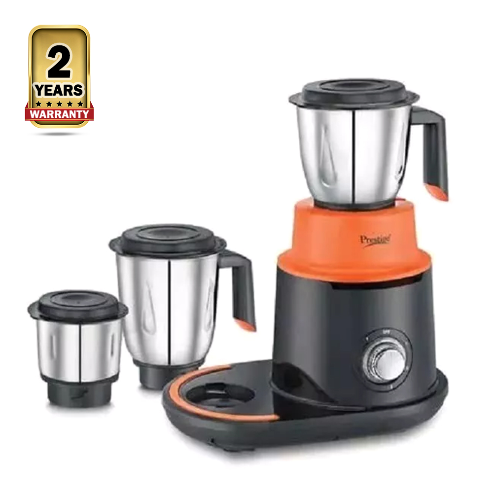 Prestige Mixer Grinder with 3 Jars - 750W - Black & Orange that can handle a variety of tasks, from blending smoothies and juices to grinding spices and chopping nuts. It has a powerful 750W motor and four stainless steel blades that can easily crush ice and frozen fruits. The blender also has a number of preset functions, such as smoothie, juice, and pulse, that make it easy to get the perfect results every time.