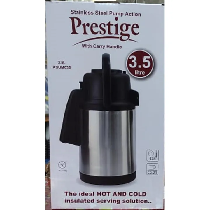 Prestige Stainless Steel Flask 3.5 Liter For Tea And Coffee, For Home, Shop Or Office Use. (Steel inside and outside) Japanese style with printing design. Cleans and stores easily Good quality. A sleek design ideal for home or office use. Locks in temperature to preserve flavor and freshness.