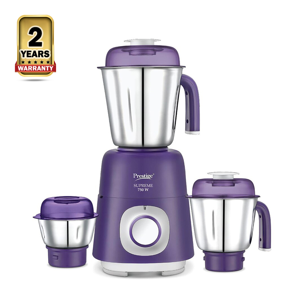 Prestige Supreme Mixer Grinder - 750W - Violet that can handle a variety of tasks, from blending smoothies and juices to grinding spices and chopping nuts. It has a powerful 750W motor and four stainless steel blades that can easily crush ice and frozen fruits. The blender also has a number of preset functions, such as smoothie, juice, and pulse, that make it easy to get the perfect results every time.
