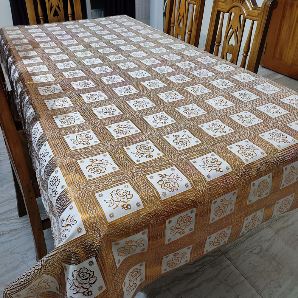 "• PVC plastic sift gold dining table cloth mat • Fits 6 chair table, 84'' by 55'' inches • Soft and durable material for long-lasting use • Easy to clean and maintain • Perfect for kitchen and dining room décor"