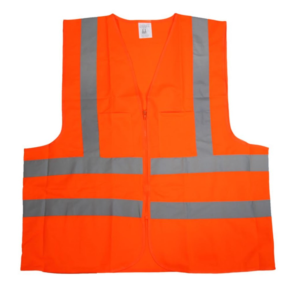 High visibility neon vest. ANSI-approved reflective strips. Hook and loop front closure. Polyester material. Premium quality product.