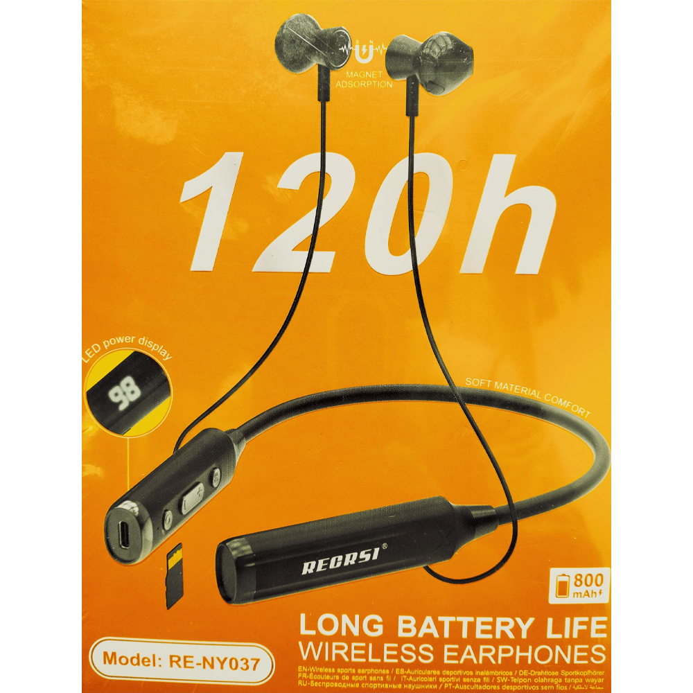 Long Battery Life & LED Power Display Wireless Earphones. Brand name: REGRSI Model: RE-NY037 Battery capacity: 800mAh Type C charging port. Charging time: 2.5 hrs Use time: 120hrs Standby time: 120 hrs Bluetooth: 5.3 Chip: JL AC7006 Weight: 50g Use TF memory card playback Soft Material Comfort Magnet Adsorption. Made in china.