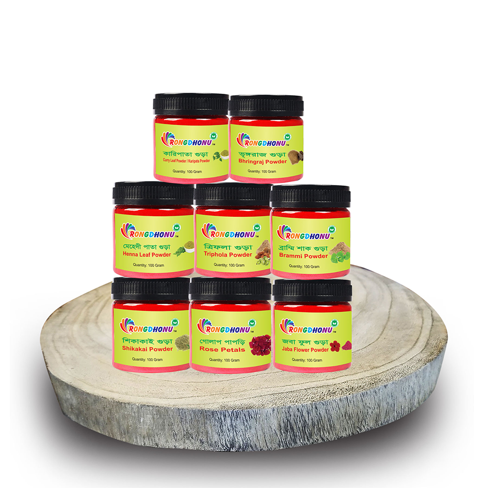 Hair Combo Pack: Curry leaf powder,Bhringraj powder,Mehndi leaf powder,Triphala powder,Brammi leaf powder,Shikakai powder,Rose petal powder,Jojoba flower powder.Reduces hair loss.Strengthens hair.Helps in new hair growth.Reduces dandruff and lice.Gives you silky and shiny hair.