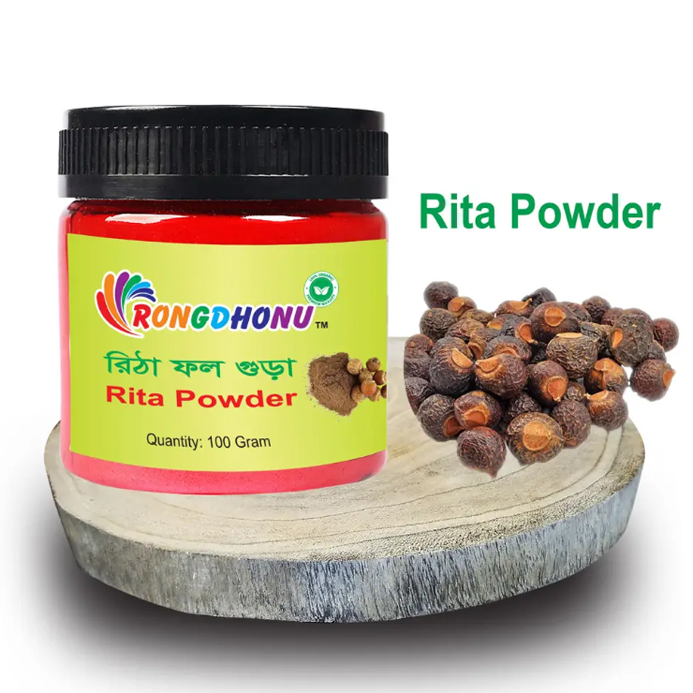 Rongdhonu Hair Treatment Ritha Powder is a hair care product that contains powdered Ritha or Reetha. Ritha is also known as "Soapnut" and is an Ayurvedic herb that is used in traditional Indian medicine for hair care. It is believed to have natural cleansing properties that can help remove dirt, excess oil, and product buildup from the hair without stripping it of its natural oils.