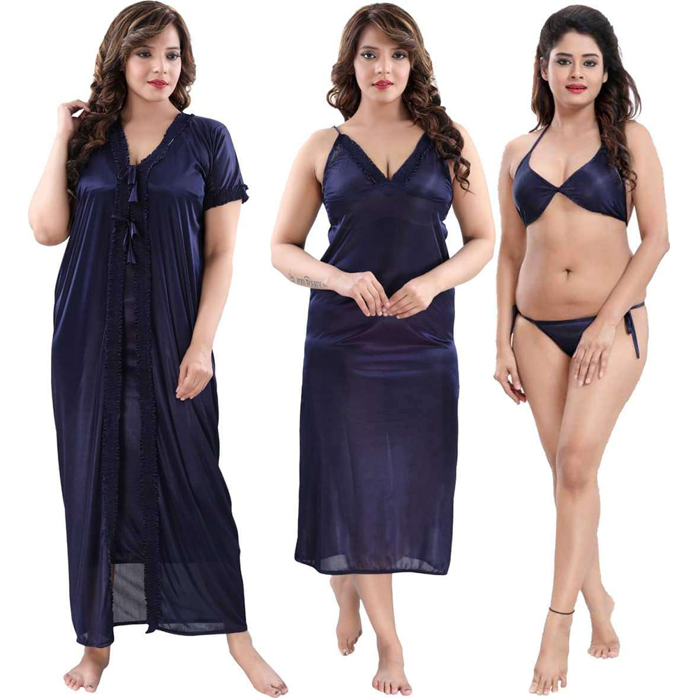 The Satin Silk 4 Part Nightwear Girls Night Dress For Women - Multicolor is a luxurious and comfortable set of sleepwear designed to flatter and entice. Made from soft satin silk, these pajamas offer a silky touch against the skin and a luxurious feel. The four-part design adds a touch of playfulness and sensuality, making them perfect for special occasions or simply for a night of relaxation.