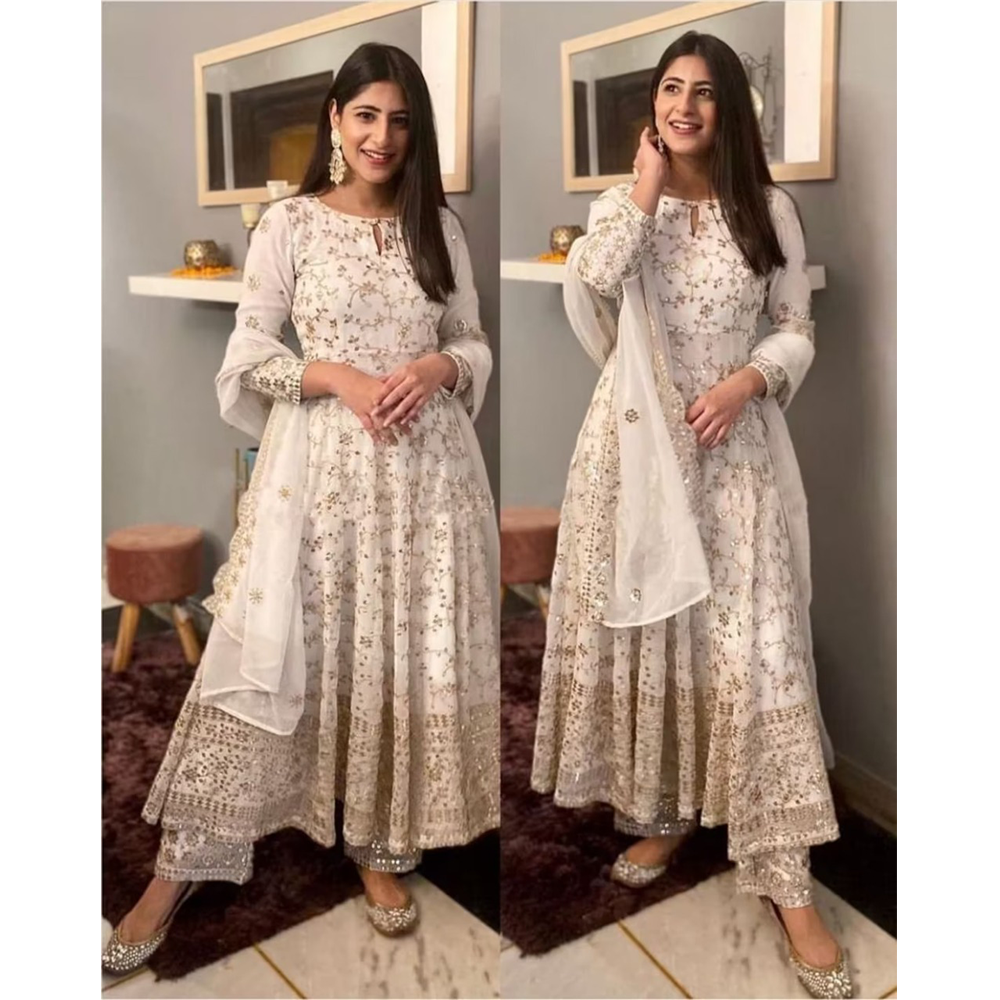 A semi-stitched weightless georgette Anarkali gown is a stunning outfit that combines the elegance of an Anarkali silhouette with the luxurious feel and flowy drape of weightless georgette fabric.