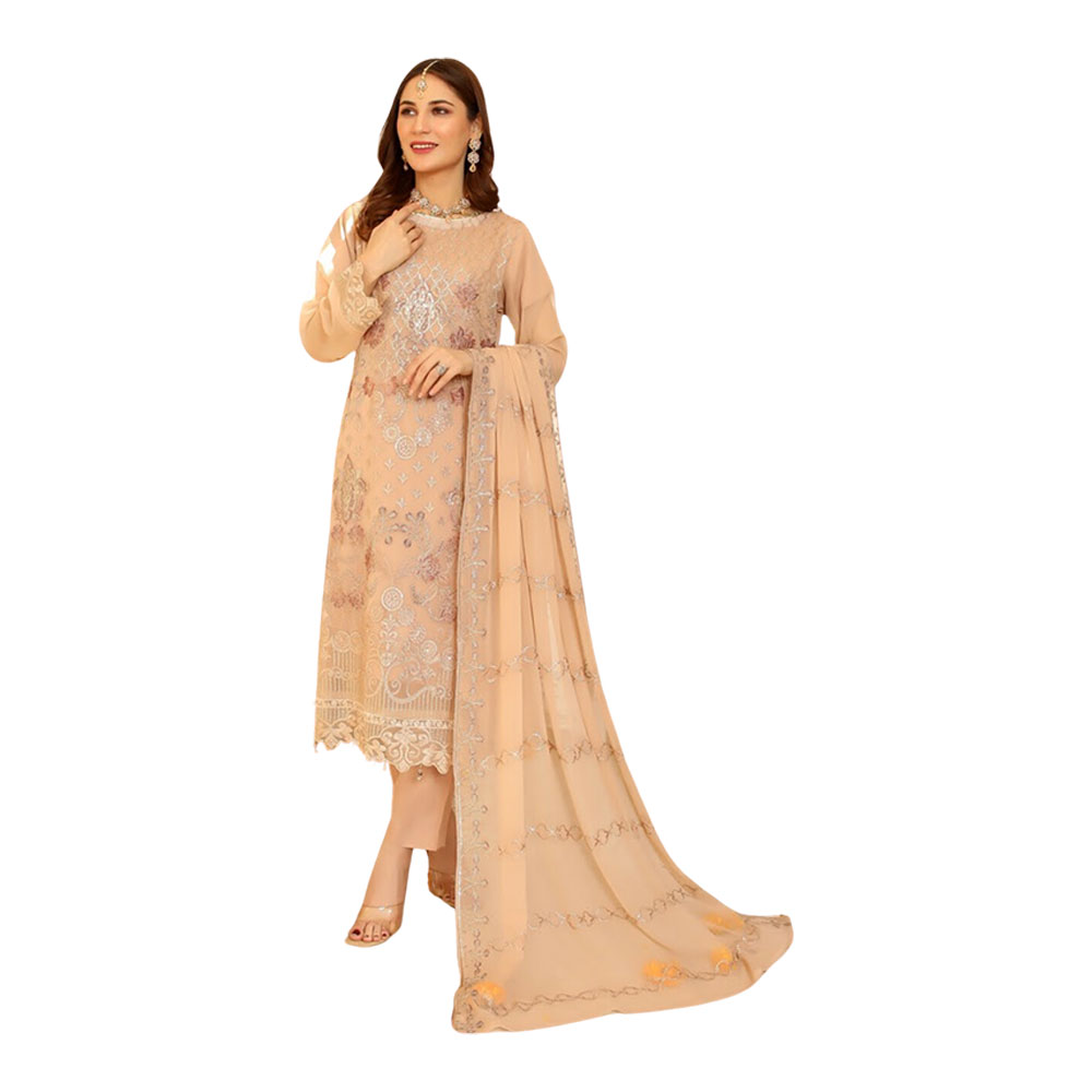 The Semi-stitched Chiffon Party Dress for Women - HP-3PP-302, complete with luxury and elegance. This fancy and exclusive ensemble features heavy embroidery on chiffon fabric, along with a beautifully crafted chiffon dupatta adorned with intricate handwork. Accompanied by a raw silk trouser, this ensemble is proudly made in Pakistan. Plus, receive a complimentary ring with your purchase!