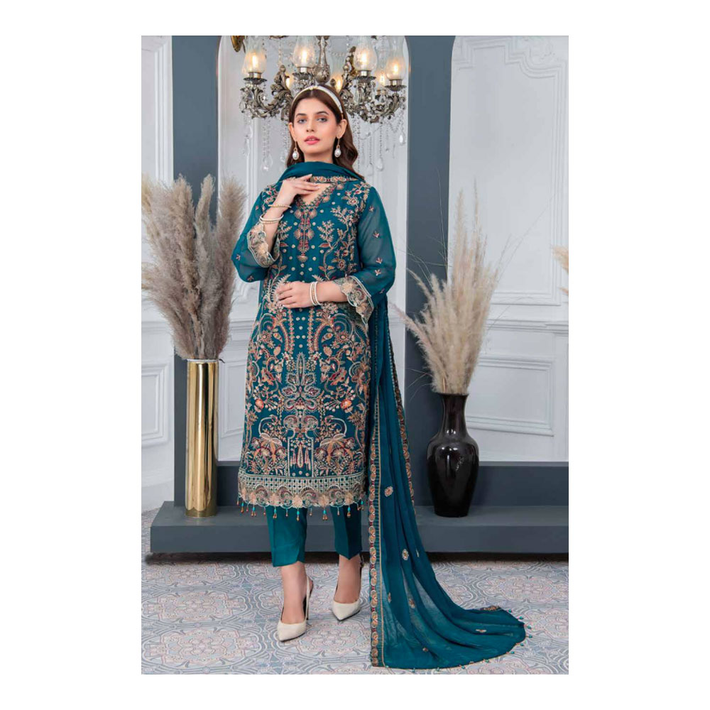 The semi-stitched luxury chiffon 3pcs ensemble: featuring an intricately embroidered chiffon body, a pure chiffon embroidered dupatta, and a solid-colored raw silk shalwar. The sleeves are adorned with delicate chiffon embroidery, adding elegance to this exquisite outfit.