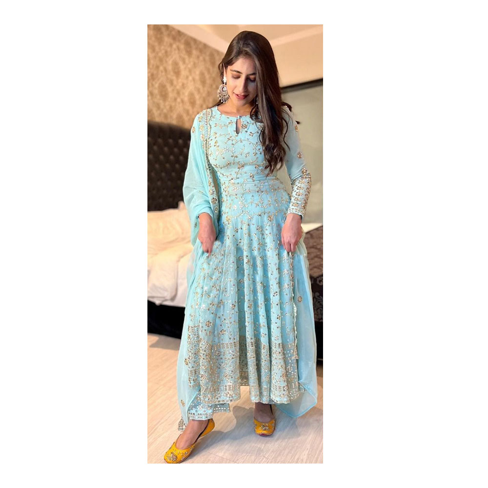 The phrase "weightless georgette party anarkali for women" evokes an image of stunning elegance and ethereal beauty. It describes a dress that's perfect for swirling on the dance floor and making a lasting impression. this luxurious color is perfect for a party or a special occasion. Pajama - Pure Butterfly Embroidery Work Veil - Weightless georgette embroidery work Body length- 50 inches Body Size- 52