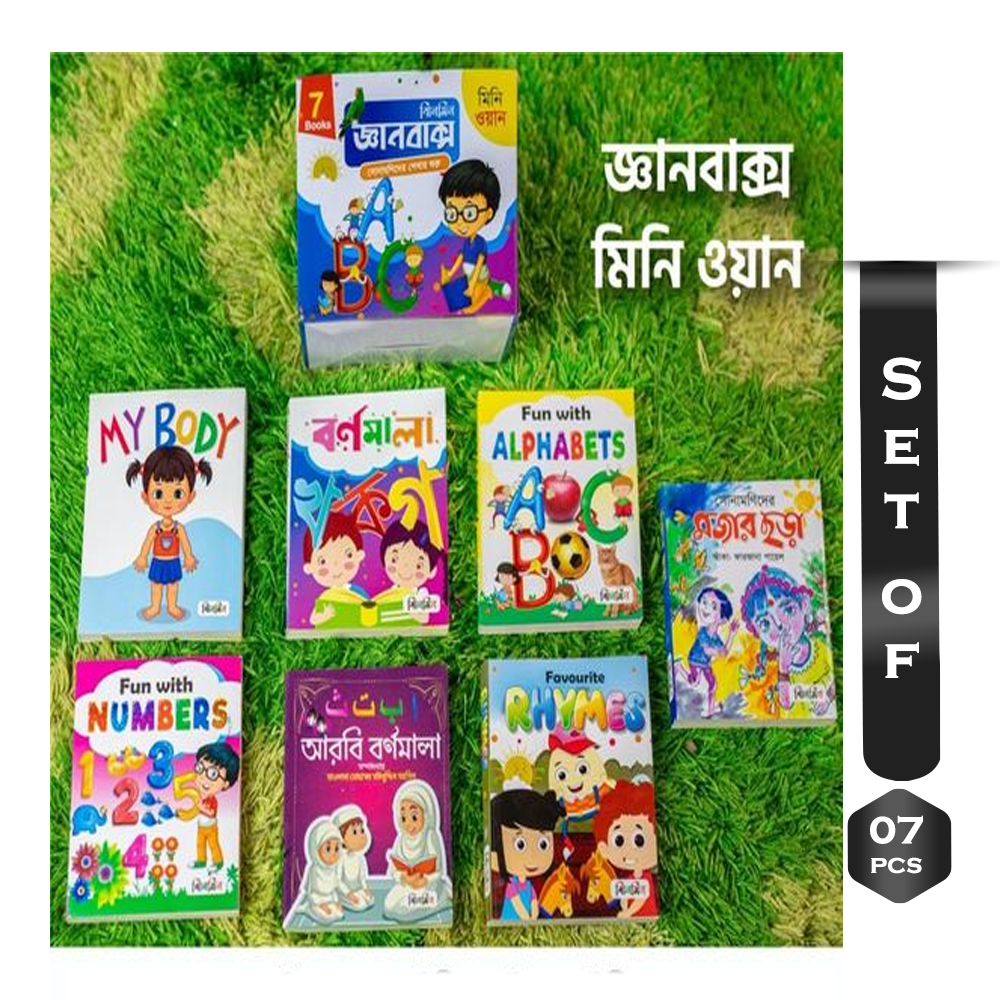There are 7 books in this box. These books are handy for children aged 2-5 years. These books are great for orally learning the alphabet, numbers, rhymes, the Arabic alphabet, parts, fruits, flowers, birds, fish, vehicles, vegetables, and animals. The specialty of Gyanbox is that each book is printed on a 700 gsm board imported from Finland. Its size is four and a half inches by three and a half inches. It is so strong that it cannot be destroyed quickly. With plastic lamination on both sides, the book will not get wet even in water. এই বাক্সে 7 টি বই আছে। ২-৫ বছর বাচ্চাদের জন্য এই বইগুলো খুব দারুন উপযোগী। মৌখিক ভাবে বর্ণমালা, সংখ্যা, ছড়া, আরবী বর্ণমালা, অঙ্গপ্রত্যঙ্গ, ফল, ফুল, পাখি, মাছ, যানবাহন, শাকসবজি ও পশুদের নাম শেখার জন্য এই বইগুলো চমৎকার। জ্ঞানবাক্সের বিশেষত্ব হলো এর প্রতিটি বই ফিনল্যান্ড থেকে ইমপোটকৃত ৭০০ জিএসএম বোর্ডে প্রিন্ট করা। এটির সাইজ সাড়ে চার ইঞ্চি বাই সাড়ে তিন ইঞ্চি। এটা এতই শক্ত যে দ্রুত নষ্ট করা যাবে না। দুইপাশে প্লাস্টিকের লেমিনেশন থাকায় বইটা পানিতেও ভিজবে না।