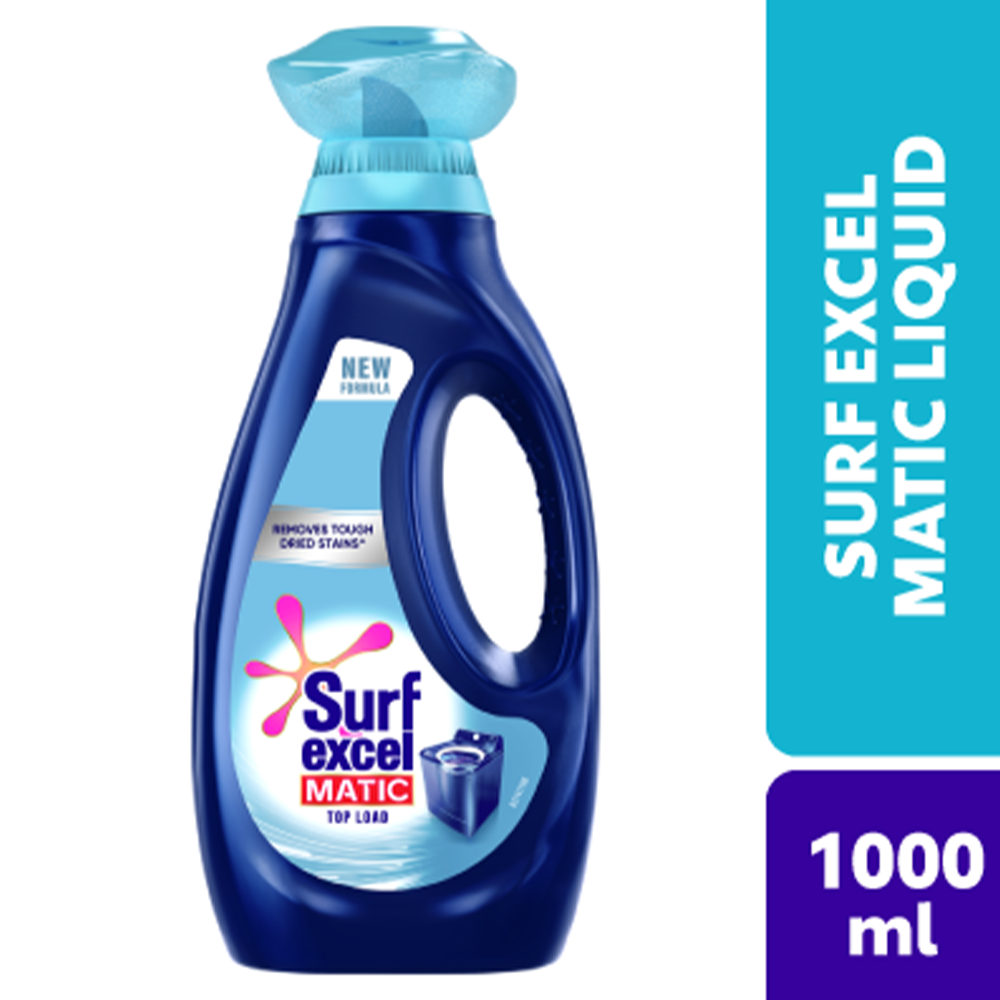 New Surf excel matic liquid top load washing detergent gives you stain removal in washing machines-Faster Stain Removal in Machines - New Surf excel matic liquid detergent with a powerful cleaning technology penetrates stains faster and removes tough stains.