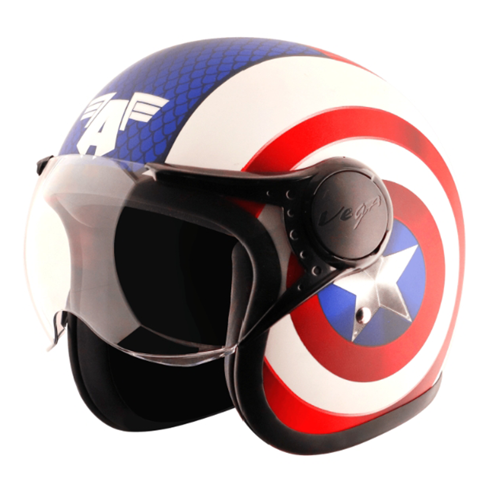 The Vega Jeet Marvel Captain Half-Face Bike Helmet in Blue is a half-face motorcycle helmet with a Captain America-themed design. Advanced ABS Shell. Comfort Liner. Anti-Scratch Visor. Washable, Removable, Breathable Padding. Coolmax Technology. Micro Metric Buckle. UV Coating. Air Ventilation System. EX -Clear Trans Windshield. European Standard Helmet.