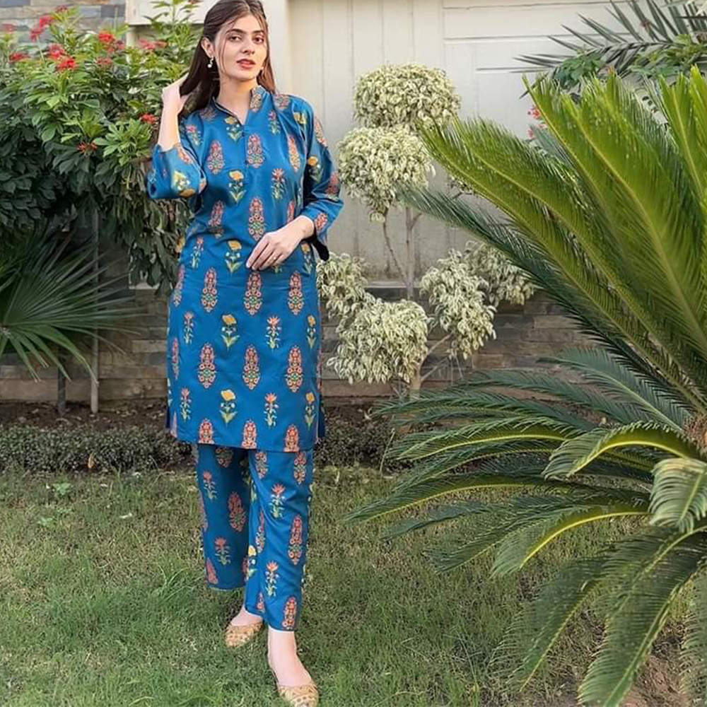 Skin-printed two-piece collection on VIP linen fabric. Nice show buttoning at the neck. Fully ready-made. Pants:- Skin printed on VIP linen fabric. It will be fully stitched.