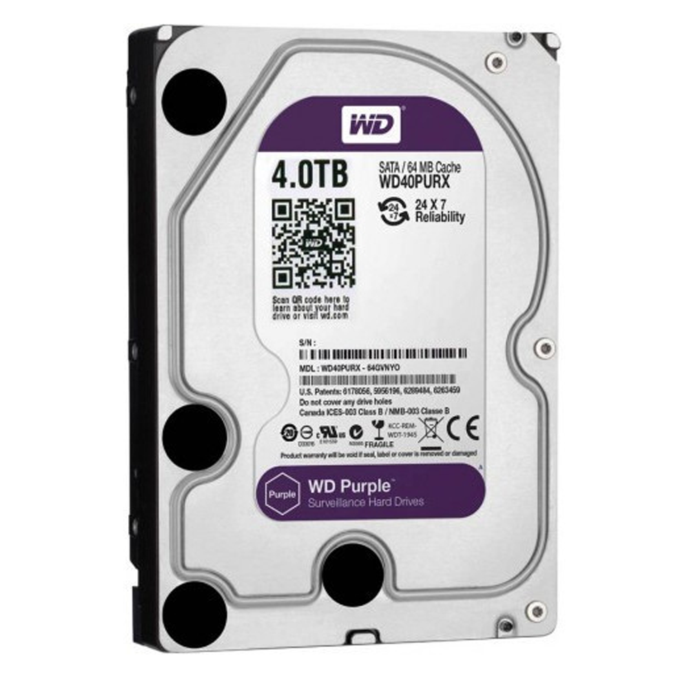 WD Purple Surveillance SATA HDD is built for 24/7 always-on surveillance in a high-definition security system, 4 terabyte capacity, 3.5-inch form factor, 5400 RPM rotational speed, ATA-600 interface, 6 Gb/s transfer rate, 64MB cache, 5.8 x 4 x 1-inch dimension.