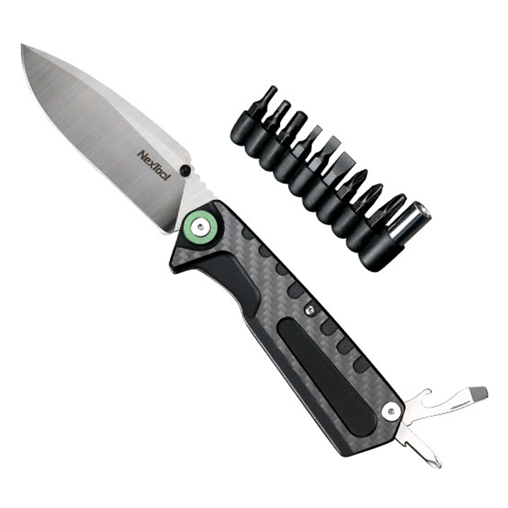 Multi-functional knife, with a folding blade, bottle opener, and 10 screwdriver heads, can easily solve different problems in daily life and outdoor camping. Meet needs like cutting rope, opening boxes, fixing the bicycle, stripping wires, etc. Exquisite material refined processing: Excellent stainless steel blade and G10+ carbon fiber handle, it can ensure stable operation in such a lightweight. Precision die-cut with a CNC machine to ensure the assembly precision and minimum interval of all parts.